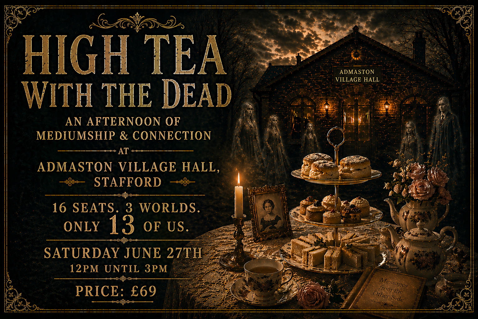 High Tea with the Dead is an intimate, midday circle set within the peaceful surroundings of Admaston Village Hall. There is a unique stillness to the afternoon—a time for reflection, refinement, and the gentle voices of those who have walked before us.